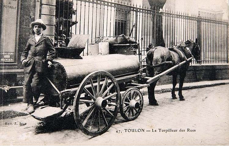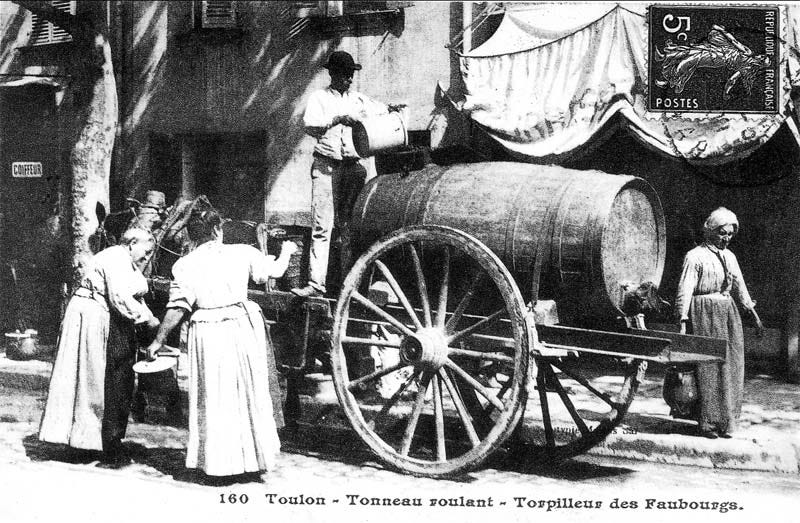 You'd better not make the mistake at the time to think this cart was a wine tank on wheels... The torpilleur des faubourgs as it was nicknamed at the time was the horse-drawn cart doing the public collecting of fecal sludge through cities without sewer system, like here in Toulon. The cart would pass at fixed hours so that people could unload their buckets (toupines) into the stinking barrel-on-wheels Not the best job in town I guess. I wonder if they'd use new casks for the job or buy second-hand ones at wineries...