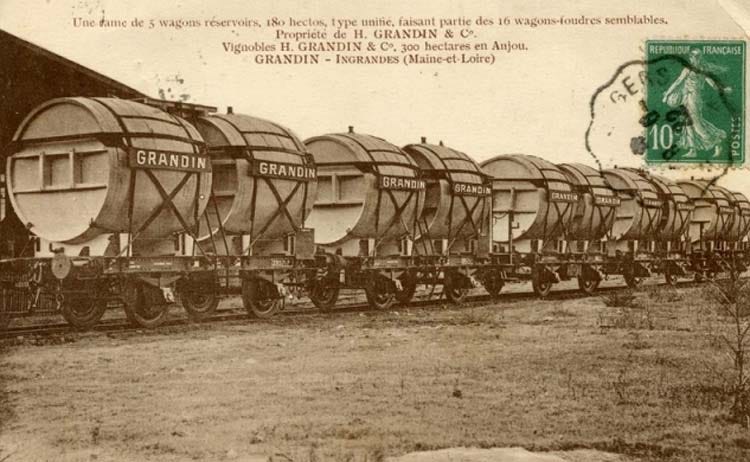 This picture shows that there were already mass bottlers producers at the time. This picture shows with pride a 5-car-strong wine train belonging to Vignobles H. Grandin & Co, a 300-hectare estate in Anjou. The scene was pictured in Ingrandes sur Loire in Anjou. Each wagon réservoir has a capacity of 180 hectoliters.