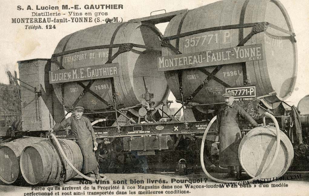 The best négoces were the ones that were able to deliver swiftly the wines to their clients, and an efficient transportation system was the key. This advertising for Lucien M.-E. Gauthier, a négoce based in Montereau-Fault-Yonne east of Paris in the direction of Burgundy hints at a well-oiled expertise in the trade. Owning such a tank car was a decisive plus compared to competitors who would ship regular-size casks by third parties.