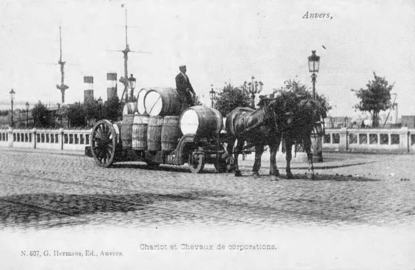 At the other end of the wine trail, horse-drawn cars were also used like here in Antwerp (Holland). The Netherlands are a good indicator in everything related to wine transport because this country/region has been importing huge amounts of wine (much of it being fine wine) to its shore. According to this webpage, the Netherlands' per capita income was the highest in Europe between 1400 and 1700. The region was trading and importing from all over the world, and for example the carrying capacity of Dutch merchant shipping in 1570 was about the same as the combined fleets of France, Germany and England. If much of the trade was done between third countries, the Netherlands were at the receiving end of the wine export. The webpage says that "wine exports from Bordeaux were running at 25 million gallons a year at the beginning of the fourteenth century. A large proportion of this went to England, some to the Baltic, and a substantial amount to Flanders and Brabant".