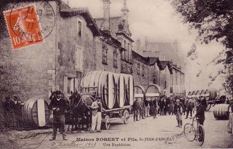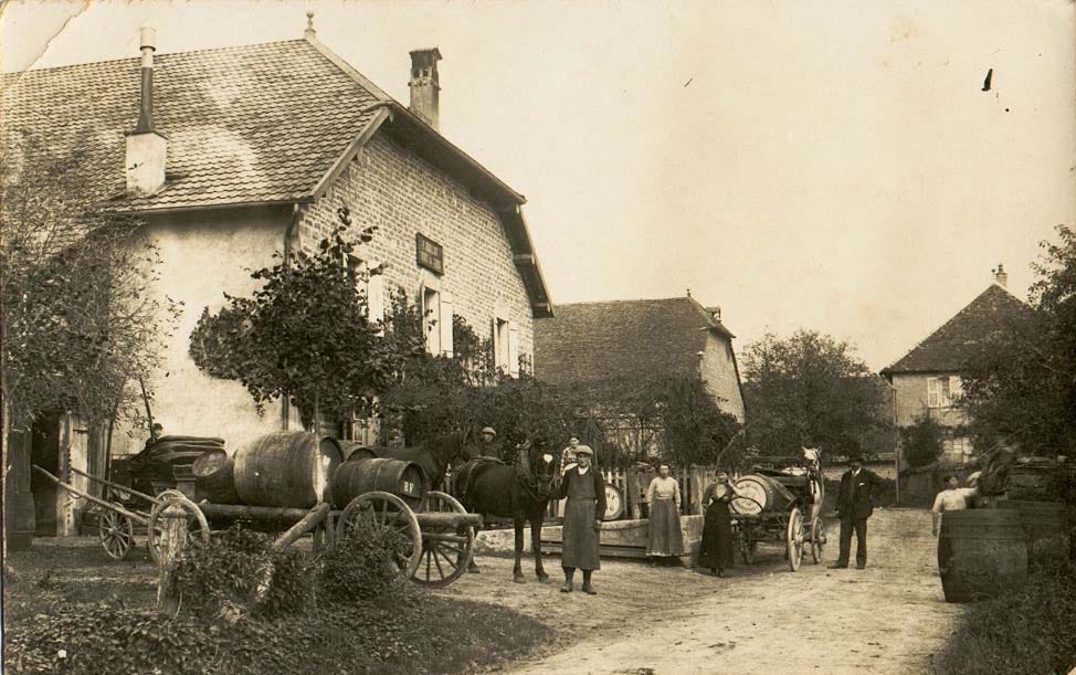 Actually in the early 20th century you had probably all the transportation means working together, like here the draft horses pulling a cart loaded with 3 big foudres. I don't know if they were full but there's a good chance, and on the cobblestone roads that was probably not easy.