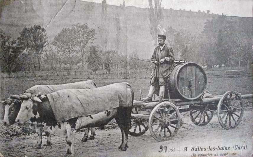 No need to say that oxen were put to contribute for the transportation of wine until maybe the first quarter of the 20th century, albeit for short distances due to their slow pace. These animals are powerfull but slow, but this was ideal for certain types of plowing which require the couple of power and slowness. This article in the NY Times says that oxen are making a comeback in certain small farms.