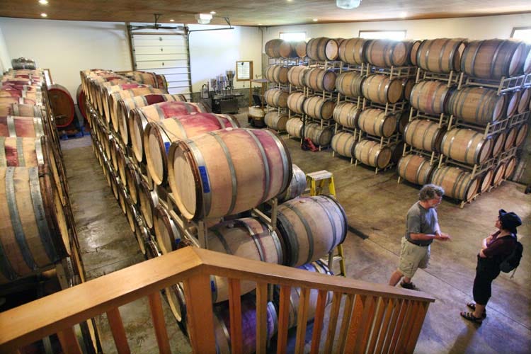 Many of these barrels are empty because they just finished bottling recently. They source their casks mostly from Burgundy but buy some in Oregon too. They keep the casks for about 7 years and buy 35 new barrels every year. They use mostly Casks from the Remond cooperage and in Oregon they buy from Oregon Barrel Works. They also buy from Sirugue in Nuits-Saint-Georges (Burgundy) and from François Frères.