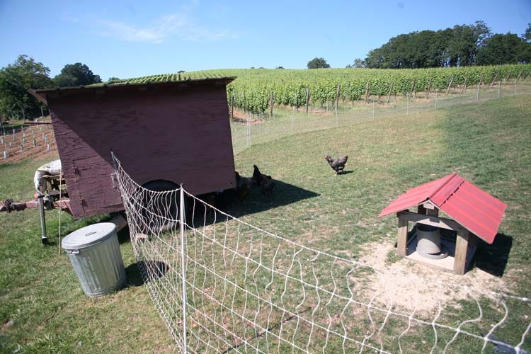 Brian says that the original idea to use mobile coops for crops was to get rid of cutworms, but ideally you'd need 100 000 chickens for 2 weeks, so this is not really feasible in the real world. Here, they rather help revigorate the parts of the vineyard which are a little weaker than the rest, like the rows along the trees.