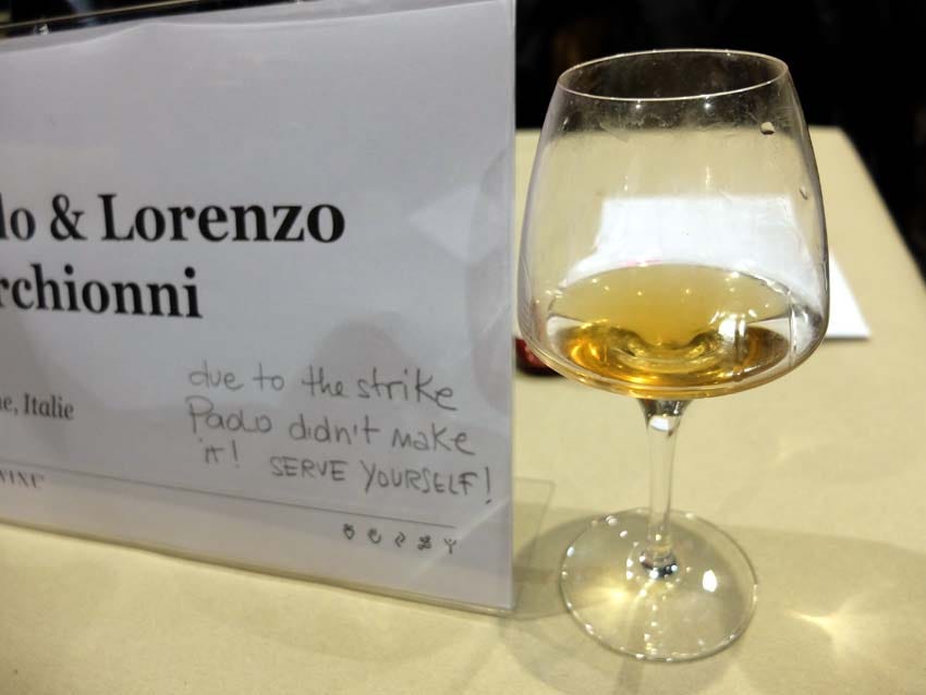Here are casualties of the strikes in the French trains nation wide, the vintners Paolo and Lorenzo Marchionni couldn't come in person from Tuscany, Italy and if we could pour ourselves tasting samples of their two cuvées there was no way to exchange with the vignerons...
