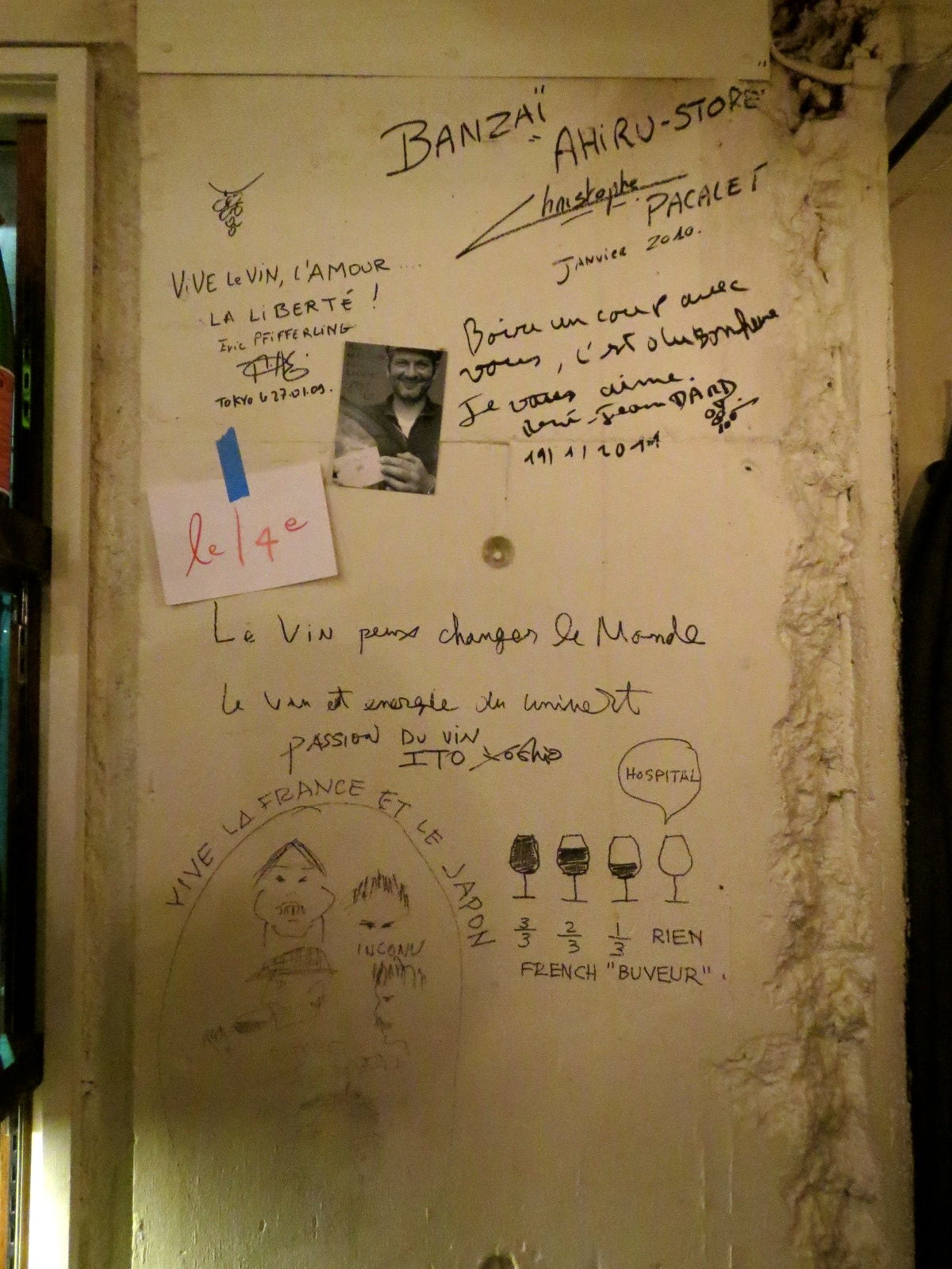 I don't know why I didn't shhot the other ones, there was Banzaï Ahiru Store by Christophe Pacalet in 2010 and Le vin peux changer le monde (wine can change the world) by importer Yoshio Ito, and also the words of René-Jean Dard (in 2011) : Boire un coup avec vous c'est du bonheur, je vous aime (drink with you is happiness, I love you)... There are a few other interesting drawings and comments, see on this picture.