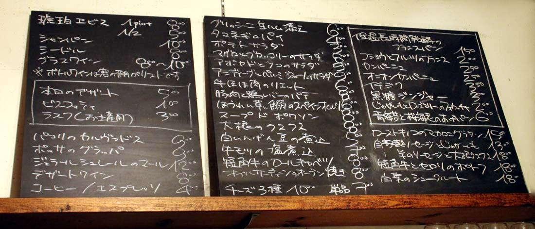 The wines seen on the left of the board, priced per glass, cost 800 Yen to 1000 Yen (makes 5,6 € & 7,7 USD to 7 € & 9,7 USD), with also beer (1 pint 800 Y & 1/2 500 Y), cider 800 Y and Champagne 1000 Yen. Also : Calvados 900Y, Grappa 900 Y, Gerard Schueller Marc 1200 Y, desert wine 800 Y. Coffee espresso 400 Y.