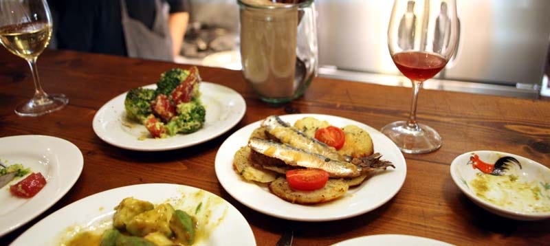 The dishes & plates are in the middle : Onion cake 400 Y, potato salad 300 Y, endive & parmesan salad 900 Y, rillettes 600 Y, pork/chicken terrine 800 Y, Spanish omelette with spinach and chicken 1600 Y, fish soup 800 Y, turnip cous cous 800 Y, 3-cheese plate 1000 Y and other dishes...