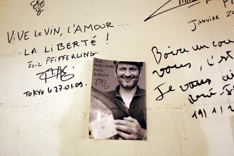 There is a piece of white wall covered with signatures and graffiti, including this piece with picture by Eric Pfifferling, the magician behind the Rhone wines of Domaine de L'Aglore.