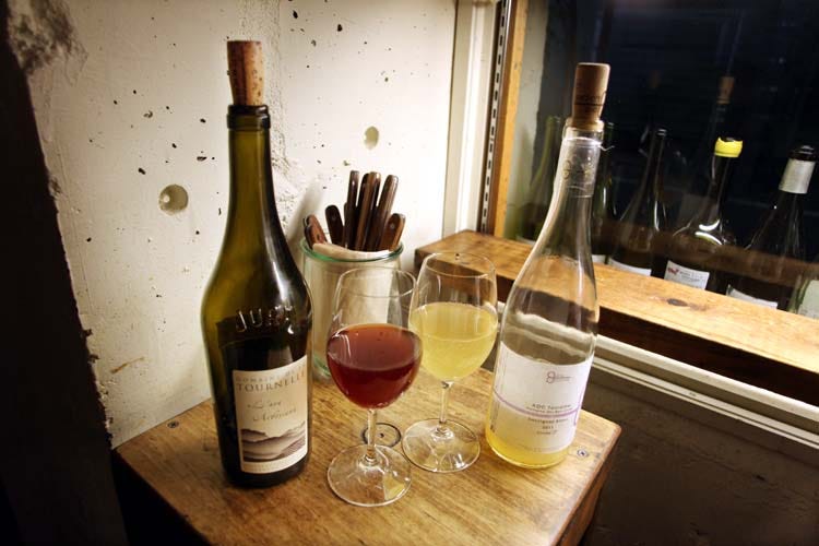 Rebekah settled her choice on a white and me on a red : she got a Touraine Sauvignon Blanc 2011 cuvée P from the Domaine les Bois Lucas (owned by Junko Arai who is also a wine importer in Japan) and me an Arbois Uva Arbosiana 2012 from the Domaine de la Tournelle in the Jura. When Teruhiko told us what was opened I jumped for this bright red from which I remembered the vividness and fruity enjoyment. But Rebekah's choice was exciting too, especially that it probably comes from one of the parcels recently purchased by Noëlla Morantin. This Sauvignon has a bright lemon-like color and was a bit turbid, with some gaz still inside, it yielded tiny bubbles glued on the inside of the glass.