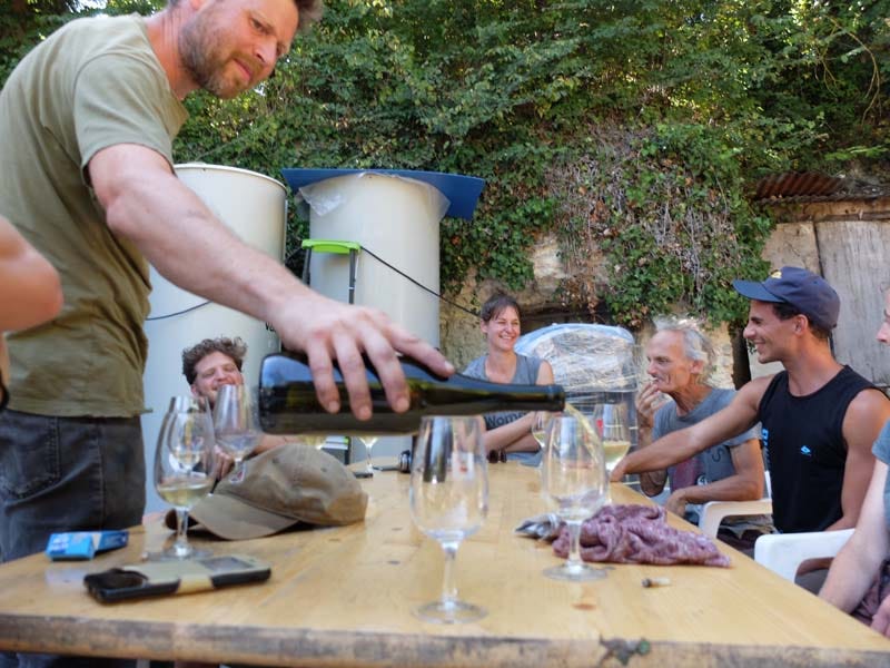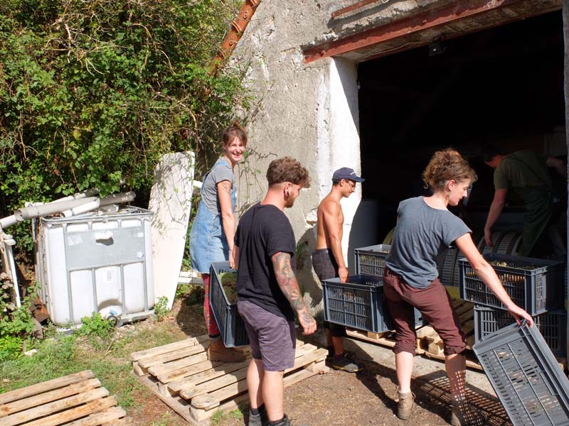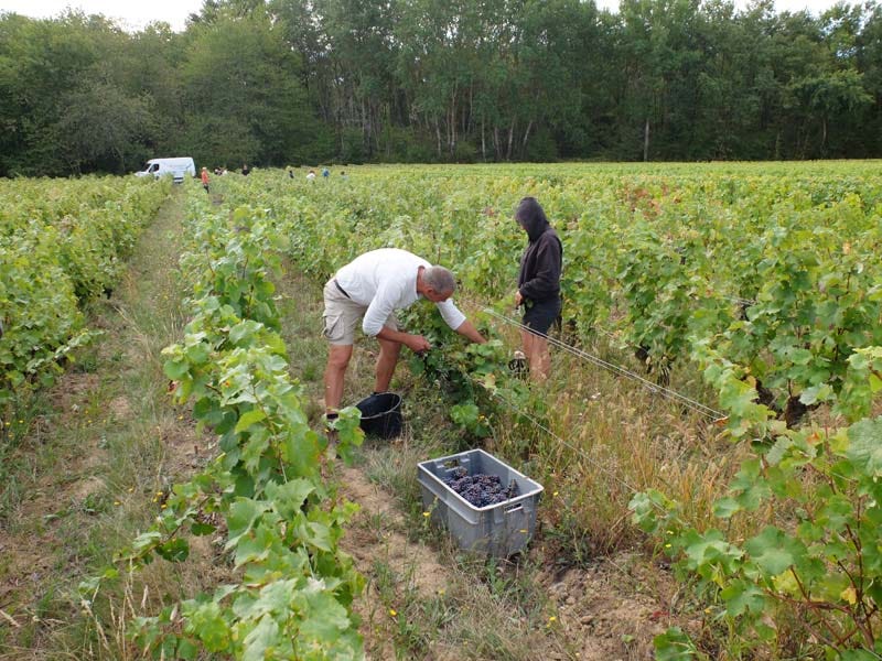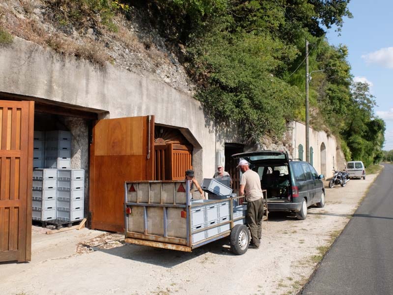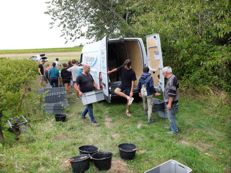 Here while the pickers are having a pause with drinks and snacks, Laurent loads a few boxes in the van. He rents this van every year at Super U for a few weeks (like 3 weeks), it’s much cheaper than hav 12 to picke one permanently. This Pineau d’Aunis parcel makes 50 ares and they’re 12 to pick it. There were 18 pickers at the beginning of the season but some have already left. Laurent has another parcel of Aunis he planted 2 years ago but it’s not yet in production.