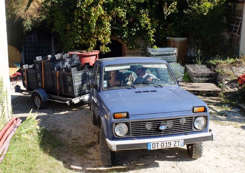 At one point I stopped again at the chai of Anouk and Paul-André (les Jardins de Théséiis), who work on the other half of Bruno Allion‘s vineyards. Actually I was riding my motorbike along the winding roads above Thésée when I spotted their Russian-made Niva with a trailer loaded with full boxes, I just followed them back to the chai. The grapes here are Sauvignon.