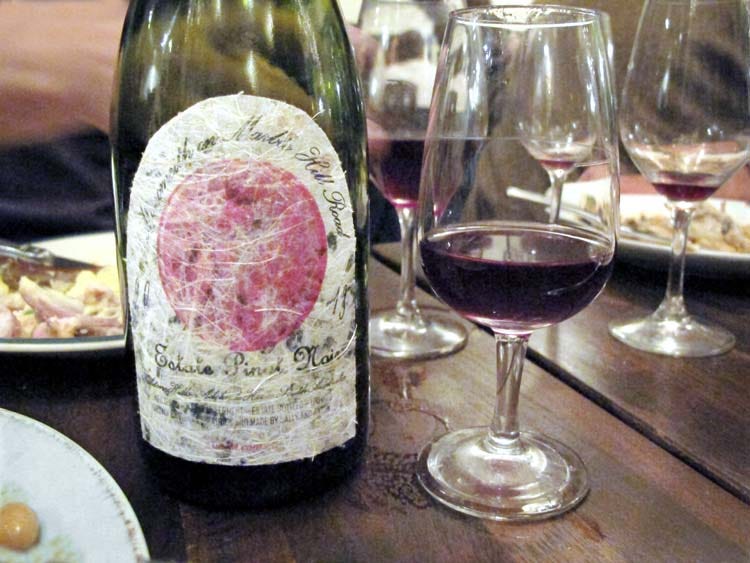 The first was a white, Le Mazel cuvée Mias (a 2013 I think), then another white, Antoine Arena’s Carco Patrimonio 2013, then Jousset’s Montlouis Singulier, Clos aux Renards 2013, and a last white, a Sauvignon from Australia brought by one of the guys : Giallo 2013 by Shobbrook Wines, a natural-wine producer there (see picture of Kevin being poured a glass by the guy who brought the bottle). The one was very nice and surprising, a skin-contact sauvignon that makes 11,8 % alc. Jamie Goode reviewed this cuvée (it might be the 2012), he says it better than me. I think we got only one red although I’m not sure now, and this was also an Australian discovery : Monomeith Estate Pinot Noir made by Lucy Margaux Vineyards, I couldn’t read the vintage on the label which seemed to be made out rice paper, I could only decipher the words natural fermentation and unfiltered and “made by Sally and Anton”. I should have asked I like tis red, it was brought by the same guy. Here is another profile of the winemaker.